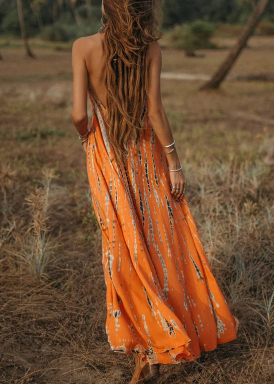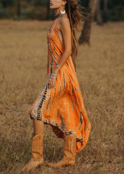 Bohemian Orange V Neck Print Cotton Long Dress Sleeveless