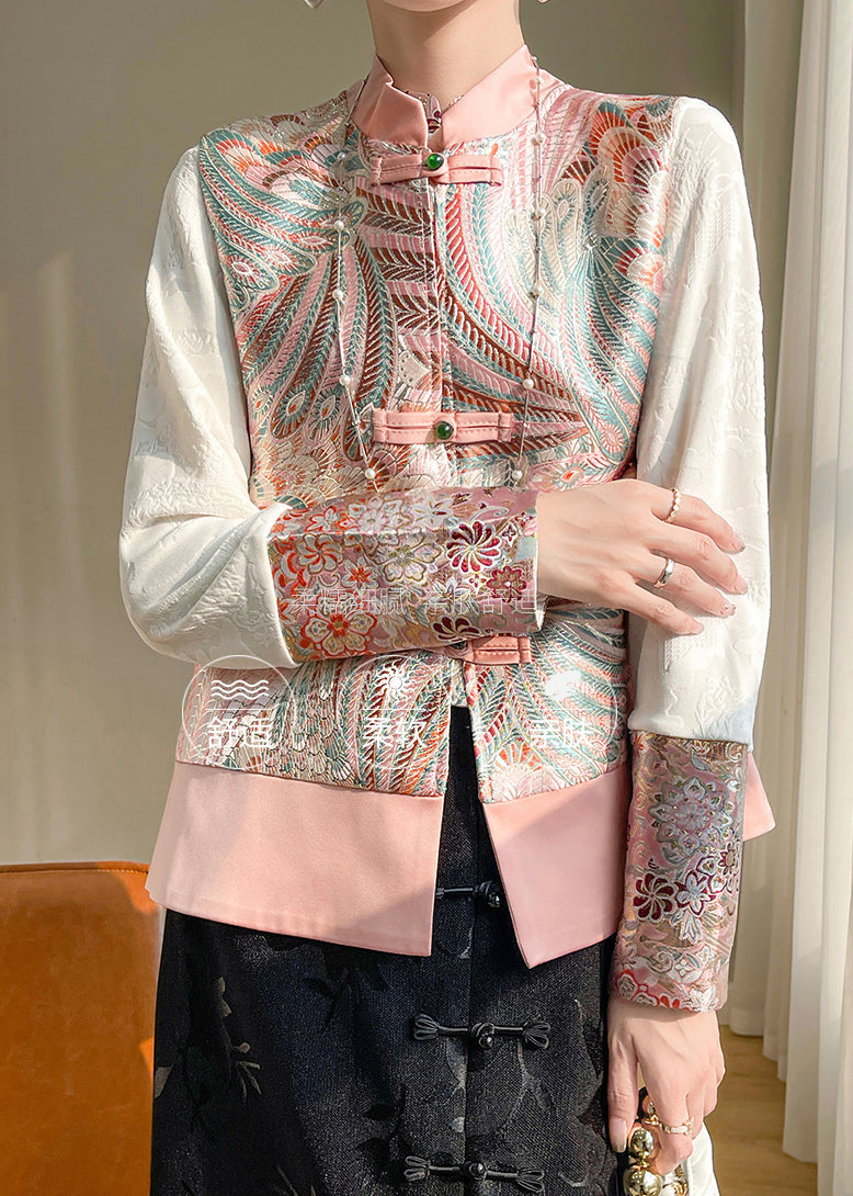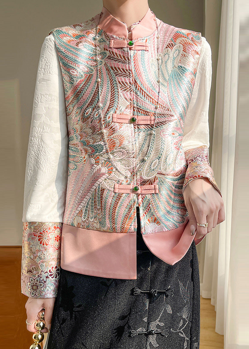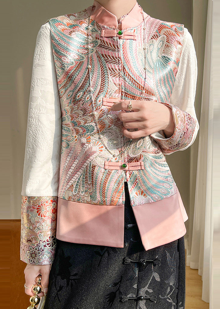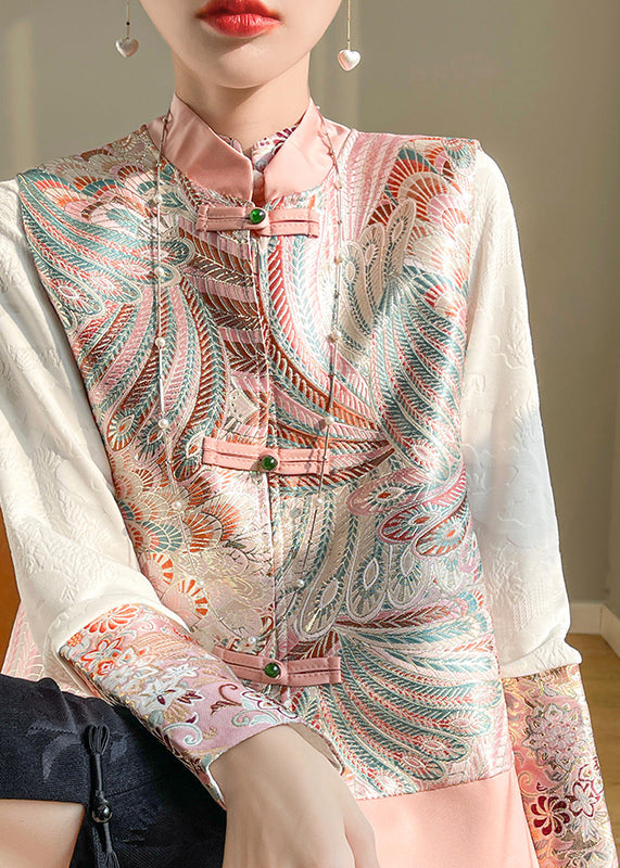 Chinese Style Pink Stand Collar Embroideried Silk Vest Sleeveless