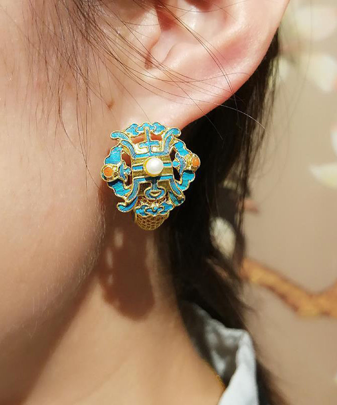 Fine Blue Ancient Gold Cloisonne Pearl Hoop Earrings
