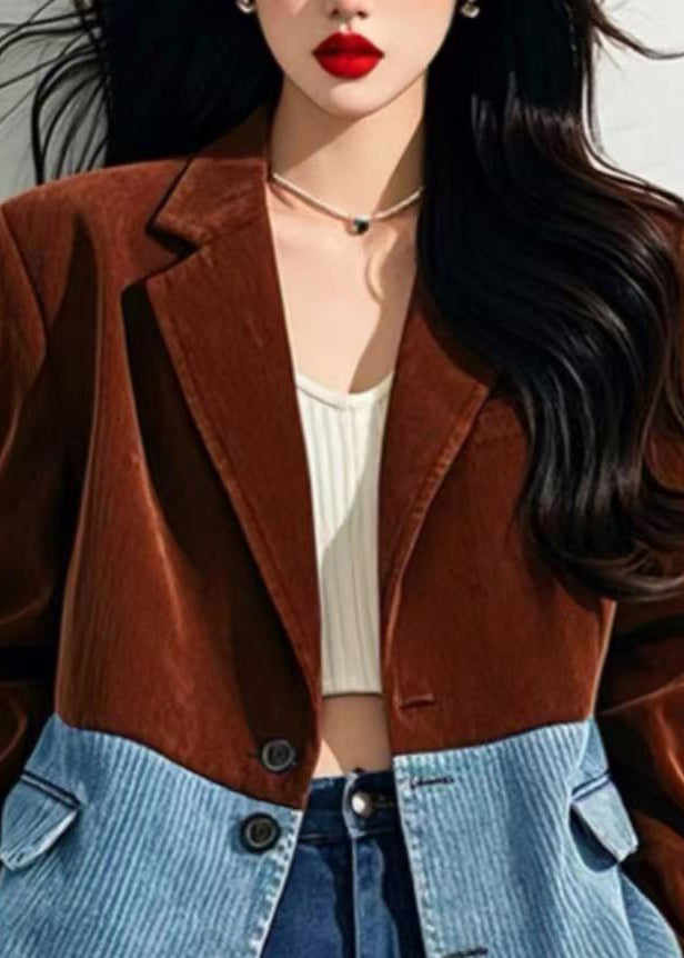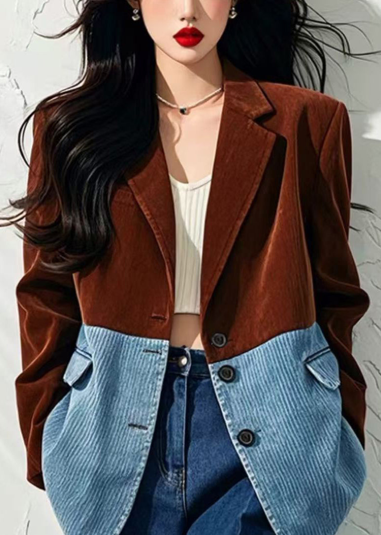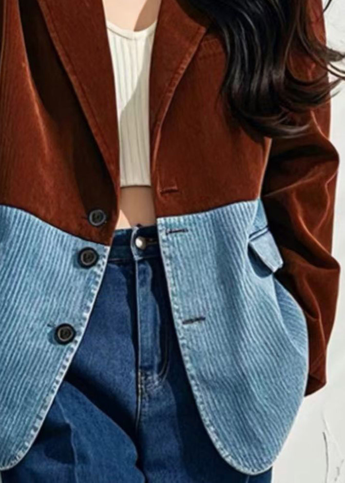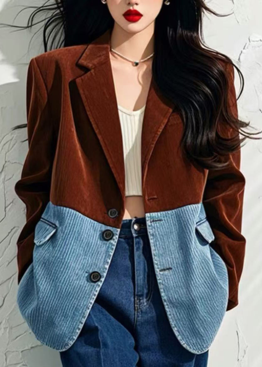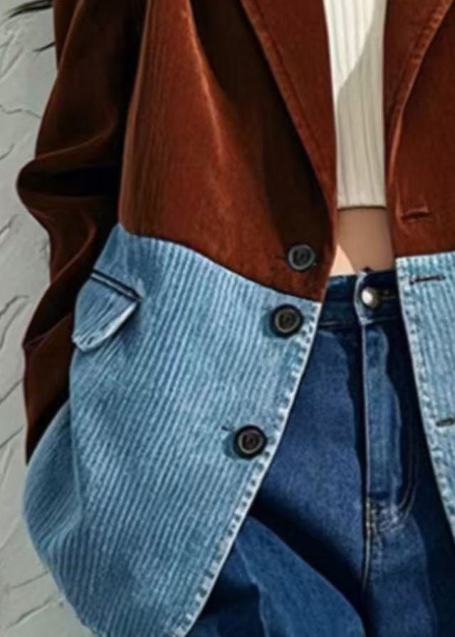 Loose Brown Notched Button Patchwork Corduroy Coats Spring Fabric: Corduroy Size & Fit: Fit: This garment fits true to size. Length: Size 2XL measures 27.3"from shoulder to hem Bust: Great for any cup size. Waist: Loose Fit. Comfortable room throughout midsection. Hip: Loose Fit - room for hips. Hand Wash Cold.