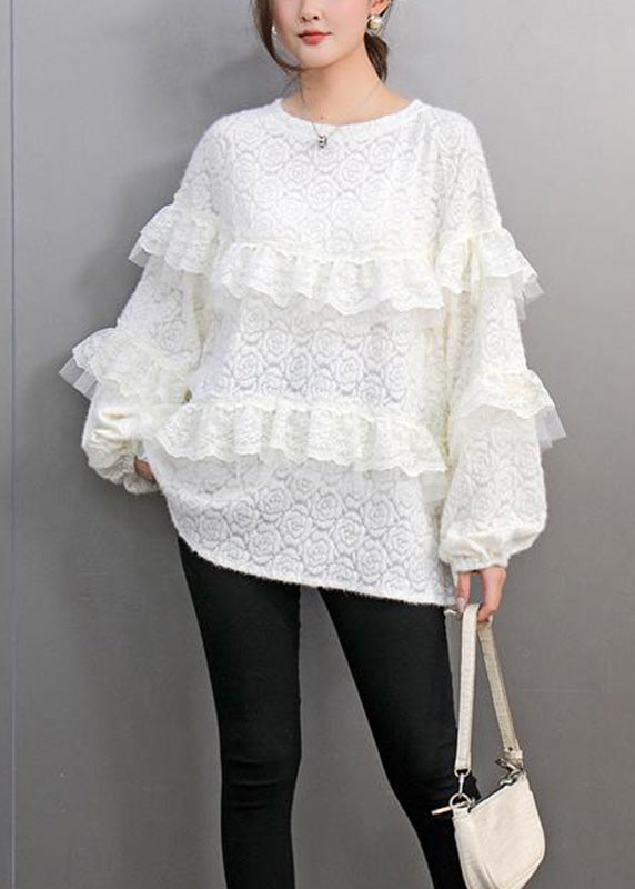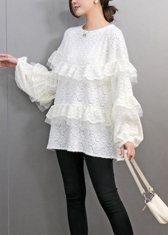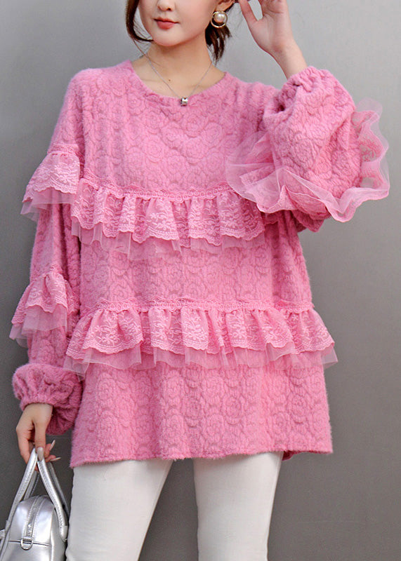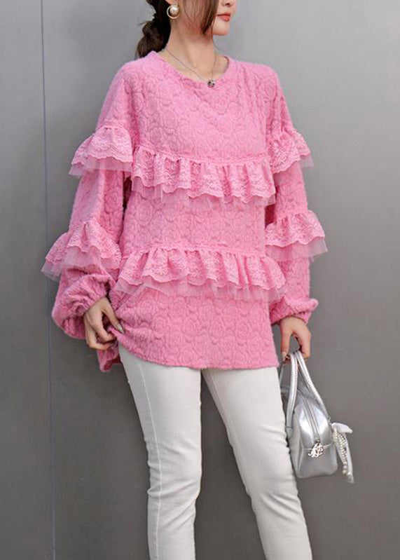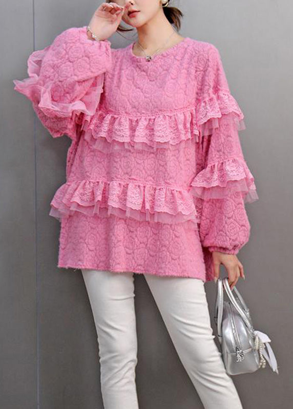 Natural Pink O-Neck Ruffled Lace Patchwork Tops Lantern Sleeve Fabric: Lace Size & Fit: Fit: This garment fits true to size. Length: Size L measures 27.3"from shoulder to hem Bust: Great for any cup size. Waist: Loose Fit. Comfortable room throughout midsection. Hip: Loose Fit - room for hips. Hand Wash Cold.