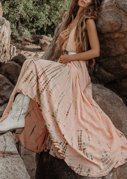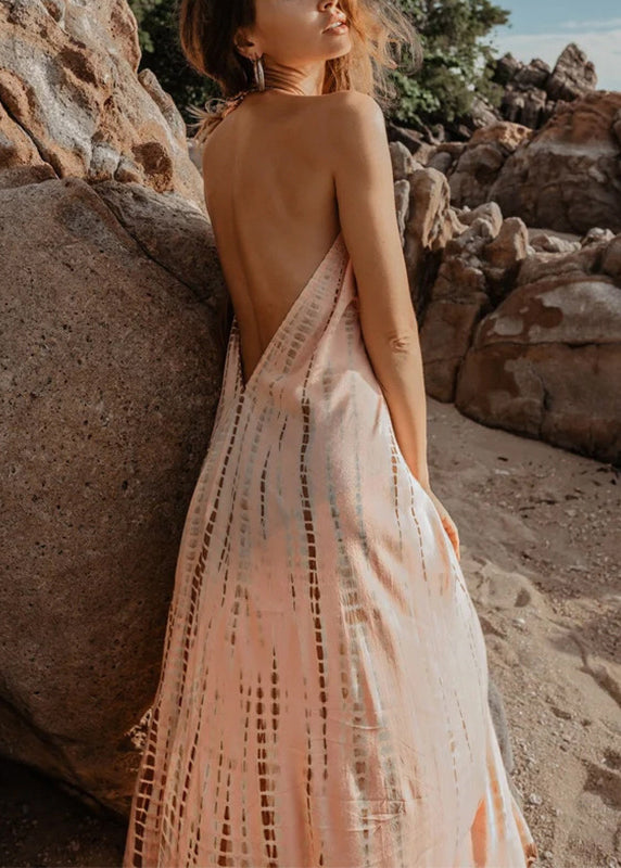 Pink Backless Cotton Ankle Dress V Neck Summer