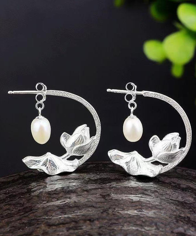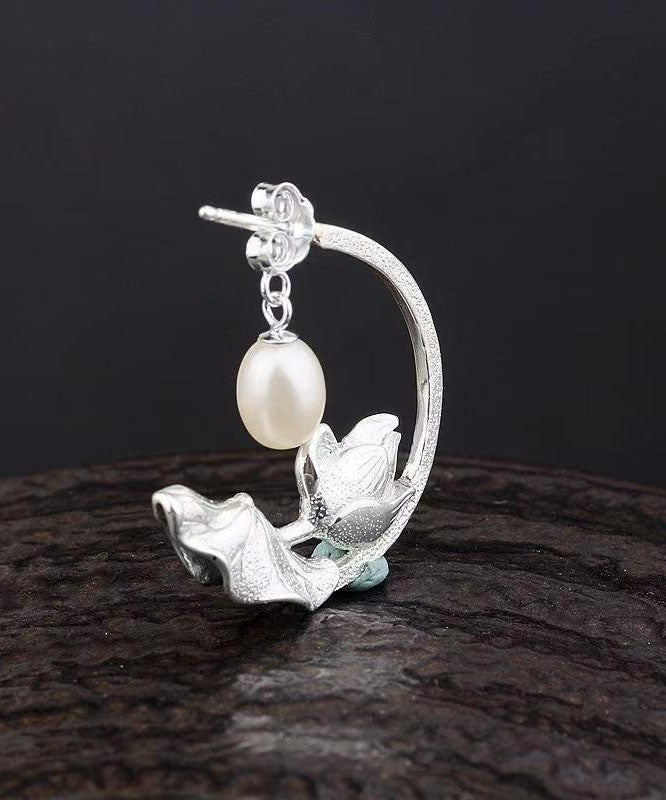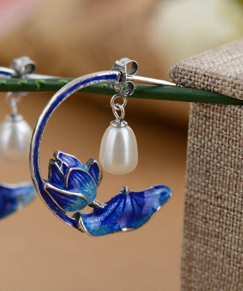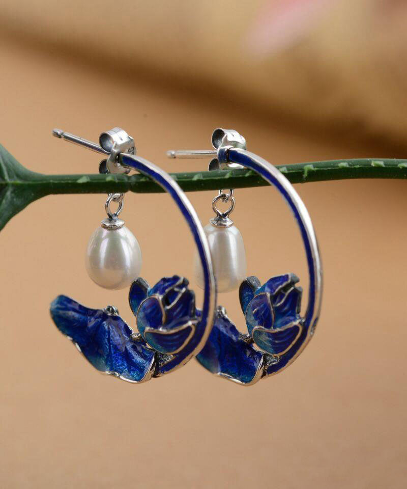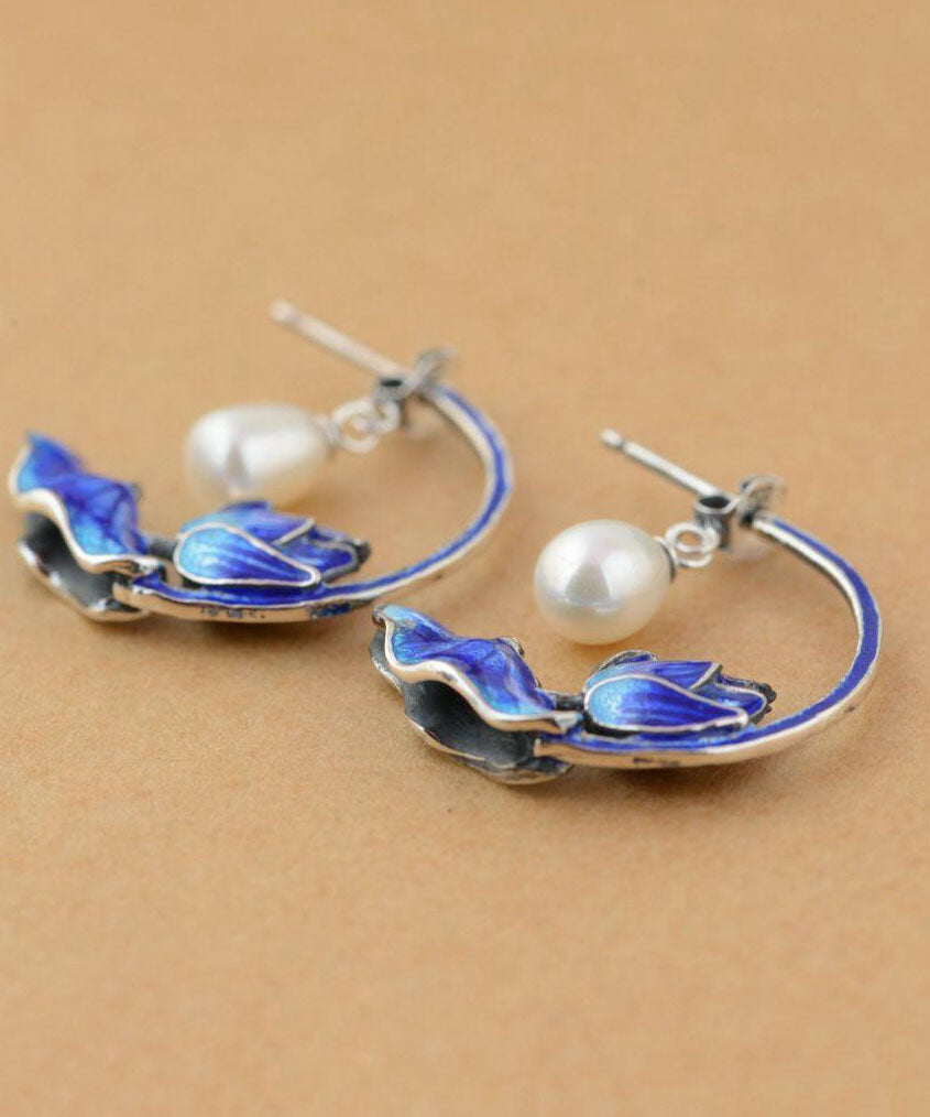 Women Blue Sterling Silver Cloisonne Inlaid Pearl Lotus Hoop Earrings